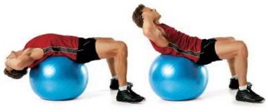 - Lie on your back on a Swiss ball with your hands behind your ears.
