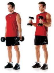 - Curl the dumbbells up as high as you can without moving your upper arms forward.