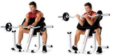 - Grab an EZ-curl bar with an underhand grip. Rest your upper arms on the sloping pad of the preacher bench and hold the bar at arm's length in front of you, your elbows bent about 5 degrees.