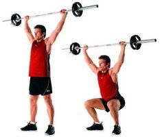 - Stand holding a barbell with an overhand grip, and press it over your head so that your arms are fully extended. The bar should be directly over your shoulders. Set your feet shoulder width apart.