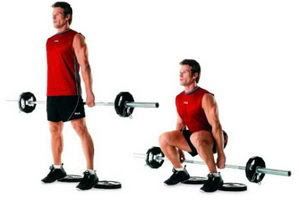 - Stand holding a barbell at arm's length behind your back, using an overhand grip. Set your feet shoulder-width apart and place each heel on a 25-pound weight plate.