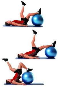 - Push your hips up so that your body forms a straight line from your shoulders to your knees. Without pausing, pull your right heel toward you and roll the ball as close as possible to your butt.