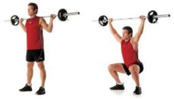 - When your thighs are parallel to the floor and your arms are fully extended above your shoulders, pause, then return to the starting position. 2 or 3 sets of 5–7 reps