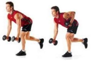 - Grab a pair of dumbbells and stand with your left foot in front of your right. Keep your back flat and bend over at the hips so the dumbbells are hanging at arm’s length, your palms facing in. Raise your right foot off the floor.