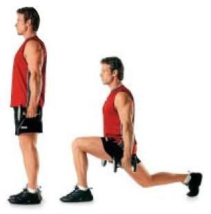 - Stand and bring your right foot up next to your left, then repeat with the right leg lunging forward at a 45-degree angle. That’s one repetition. 2 or 3 sets of 10-12 reps