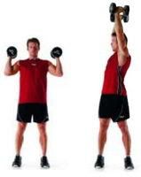 - Stand holding a pair of dumbbells just outside your shoulders at jaw level, palms facing in.